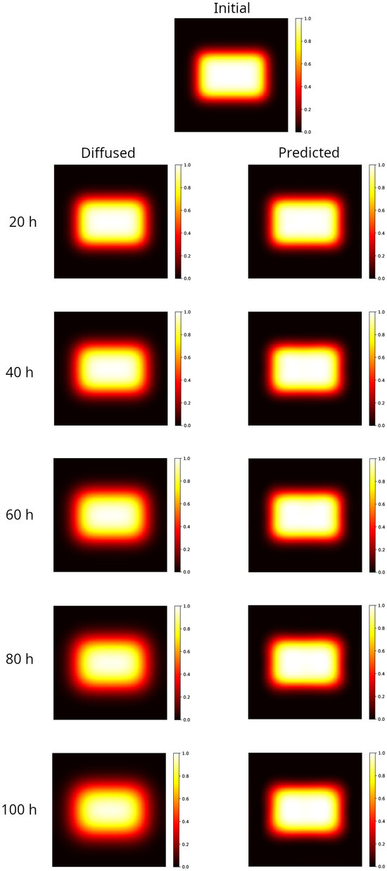 As conducted for the rectangular distribution, in Figure 2 results are shown for the circular distribution evolved forward in time in the interval 20–100 h (left column panels), to be compared to the initial distribution (top panel). The blurring effect is noticeable: the hyper-intense region remains sharp only at the center of the spot, while the edges lack definition, though the circular symmetry is maintained. For the sake of comparison, the distributions reconstructed by the PINN method, starting from the corresponding diffused shown in the left panel, are also shown in the right panels of Figure 2.