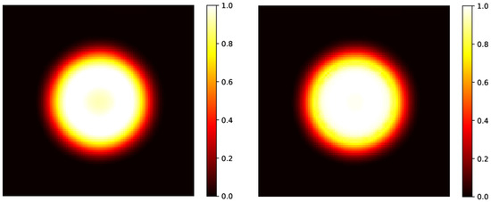 Left panel: predicted initial circular distribution without the application of a median 2D filter, already shown in Figure 2, right bottom panel, reconstructed after evolution at h. Right panel: predicted initial circular distribution after the application of the filter. As already shown in the linear profile in Figure 3, the initial hyper-intense area is almost recovered.
