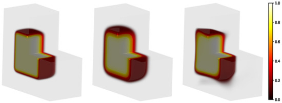 Modeling of a 3D sample partially irradiated using a uniform beam (the radiation hits the plan on the left in the figure). Square-spot area: . Matrix gel in light grey volume: . Left panel: initial distribution; central panel: distribution evolved forward in time, h; right panel: predicted initial distribution.