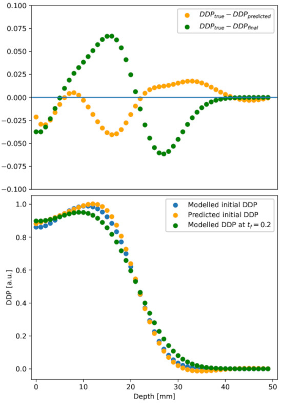 Depth dose profile. Lower panel: depth dose profile in the initial, diffused at h, and predicted initial conditions. Upper panel: difference between diffused or predicted initial depth dose profile and the initial one. The PINN result (orange points) is in good agreement with the initial distribution, at variance with the diffused (green points), in almost all depth ranges.