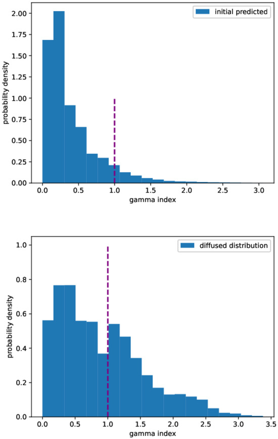 Gamma index distribution. Upper panel: predicted initial distribution. Lower panel: diffused distribution. Gamma index calculated at 3%/2 mm.