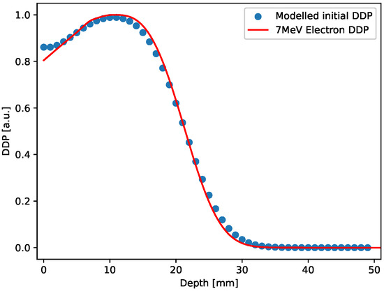 Red curve: Depth dose profile for a 7 MeV electron irradiation; blue circles: Depth dose profile extracted from the 3D initial distribution, after smoothing.