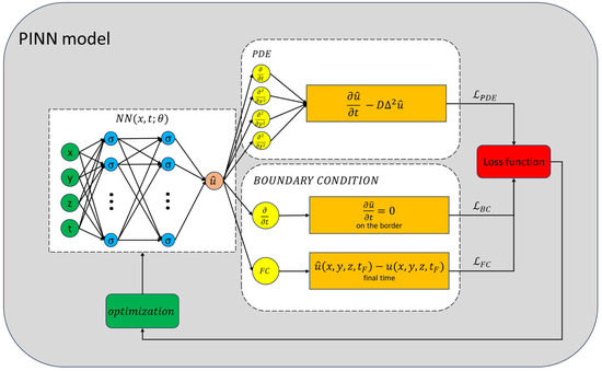 Let us denote the position vector in a three-dimensional space as . We call a generic NN with parameters , whose input is a point in space at a certain time t. To force a PINN model in respecting a given equation, the parameters have to be optimized making use of an ad-hoc built loss function. The most straightforward way to build a loss function from a Physics equation is by calculating the MSE of the residuals over a set of testing points. So, starting from the diffusion equation (Equation (2)) and given a set of N points , the MSE of the residual is as follows: