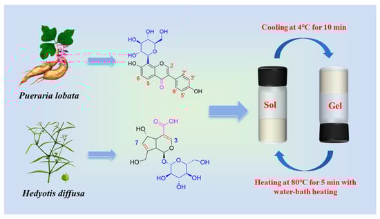 Puerarin (PUE), an isoflavone derivative extracted from Pueraria lobata, exhibits diverse biological effects including blood pressure reduction [17], wound infection treatment [18], anti-inflammatory properties [19], anticancer potential [20], antiviral properties [21], diabetes management [22], cardiovascular and cerebrovascular disease prevention [23], and anti-anxiety effects [24]. Deacetylasperulosidic acid (DAA) is a significant constituent of Hedyotis alba and Fermented Morinda citrifolia L. (Noni). Current research on DAA primarily focuses on its botanical origin and pharmacological activities [25], with its anti-inflammatory [26], antioxidant [27], and anti-obesity properties [28]. Despite its numerous pharmacological activities, the clinical utility of PUE is constrained by its poor solubility and bioavailability [29]. Presently, researchers have devised puerarin hydrogels [30], clathrates [31], nanoparticles [32], and other formulations, primarily emphasizing the interaction with polymers, coating, or covalent linkage. Nonetheless, a safe and easily degradable hydrogel consisting of only small molecules aimed at enhancing puerarin solubility still remains unreported.