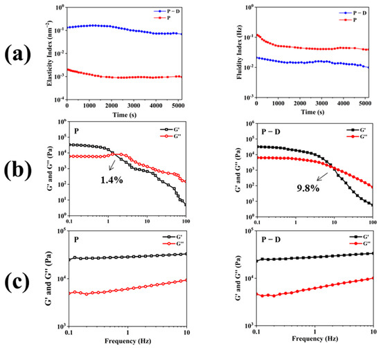 Micro-rheological tests were conducted on both gels. Figure 3a displays the test results of P gel and P − D gel at the same concentration at room temperature. The data demonstrate that the elasticity index (EI) of P − D gel is significantly higher than that of P gel, indicating a substantial improvement in the elasticity of P − D after co-assembly with DAA. The fluidity index (FI) reflects the sample’s flow capacity under shear forces, and a higher FI value indicates better flow.