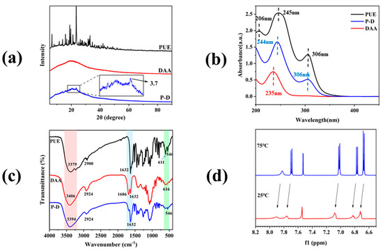 (a) XRD results of the monomer of PUE, DAA, and P − D gel; (b) UV spectra of the monomer of PUE, DAA, and dried P − D gel; (c) FTIR spectra of PUE, DAA, and P − D gel; (d) 1H NMR spectra of dried P − D gel in D2O at 75 °C (top) and 25 °C (bottom).