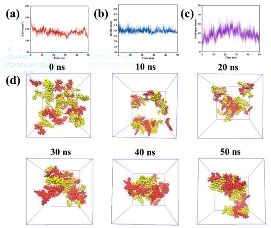 Studies have shown that all-atom molecular dynamics simulations (MDS) have emerged as a key tool to explain the aggregation stage of supramolecular gelation in depth. The method has gained prominence as an approach for comprehending the gelation process [45]. In order to study the co-assembly process of P − D gel and the tightness of the final complex structure, we carried out MDS. Moreover, some parameters can be obtained from the MDS to explain the process of supramolecular gelation. Solvent accessible surface area (SASA) refers to the cumulative surface area of molecules that can interact with the solvent. This parameter is indicative of the molecular–solvent interactions as well as the aggregation behavior among molecules [46]. Adverse interactions between the solvent and the molecules can lead to aggregation, resulting in a reduced SASA. As shown in Figure 6a, there is a notable decrease in SASA between 0 and 5 ns, indicating a swift aggregation of PUE and DAA molecules during this period. The lowest SASA value observed at 30 ns signifies that the system has achieved its maximum aggregation state by this point. The root mean square deviation (RMSD) is a metric for evaluating molecular fluctuations throughout the simulation [47]. Similar trends to the SASA are evident in Figure 6b, confirming that the PUE–DAA composite system attains a relatively stable configuration following 30 ns of simulation. Additionally, the simulation process calculates the number of intermolecular hydrogen bonds, with results depicted in Figure 6c indicating an average of 19.5 hydrogen bonds, peaking between 25 and 30 ns. This finding underscores the significant role that hydrogen bonds play within the P − D molecular complex system. Cluster analysis of the simulation trajectory for the complex system was conducted using the CLUSTER module of Gromacs. Figure 6d shows that all of the molecules in the complex system can aggregate to form a stable cluster of nanofibers as the simulation time continuously accumulates. This is consistent with the microstructure displayed by the SEM.