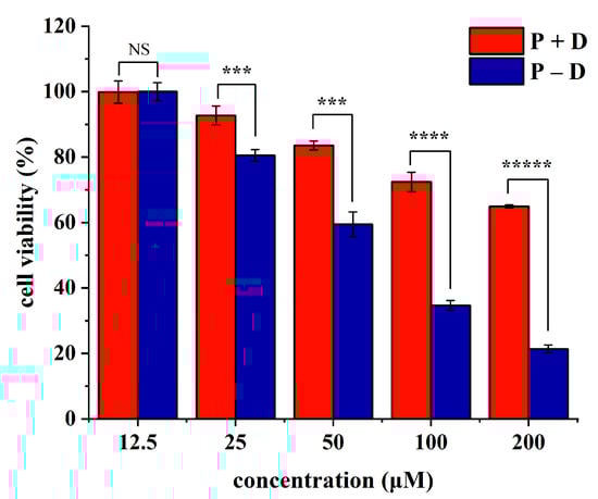 The 1.2 × 104 healthy SW1990 cells were seeded onto 96-well plates and cultured in a 5% CO2 incubator at 37 °C for 24 h. Subsequently, P + D and P − D (12.5, 25, 50, 100, 200 μM) were added for another 24 h, followed by the assessment of cell viability.