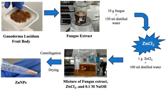Ganoderma Lucidum mushroom extract and ZnCl2 salt were used to synthesize NPs by the green synthesis method. A procedure that removes solvents with the help of a centrifuge and obtains the solid phase was used, as shown in Figure 1. The green synthesis of ZnO nanoparticles leverages the reducing properties of phytochemicals found in plant extracts to transform metal precursors into nanoparticles. These naturally occurring compounds, which include antioxidants and non-toxic molecules, serve dual roles as both reducing and stabilizing agents during nanoparticle formation. Notable phytochemicals such as terpenoids, flavonoids, phenolic compounds, aldehydes, and alkaloids are pivotal in driving the reduction process. The type and concentration of these phytochemicals differ among plant extracts, which significantly impacts the efficiency of nanoparticle synthesis. Several factors—such as pH, temperature, contact time, metal salt concentration, and the specific phytochemical profile—play crucial roles in determining the synthesis, stabilization, and yield of the nanoparticles. A stabilization mechanism for metal ions in plant extracts typically involves three stages: (1) Activation Phase—the reduction and nucleation of metal ions; (2) Growth Phase—the stabilization of the formed nanoparticles; (3) Termination Phase—the final shape formation of the nanoparticles. Through the action of phytochemicals, metals like copper, silver, gold, titanium, zinc, iron, and nickel undergo transformation into their corresponding oxides. This process supports the growth and stabilization of metal ions, which subsequently combine with oxygen to form nanoparticles with distinct shapes [25]. Plants are abundant sources of biomolecules such as polyphenols, flavonoids, terpenoids, alkaloids, and saponins, all of which contribute to the green synthesis of nanoparticles by acting as reducing, capping, and stabilizing agents [26]. Ganoderma lucidum, commonly known as the Reishi mushroom, has a long history of use in traditional medicine. This mushroom is composed of non-volatile elements like ash, carbohydrates, fats, proteins, and raw fiber. Furthermore, it is rich in bioactive substances, including proteins, steroids, nucleotides, terpenoids, phenols, glycoproteins, and polysaccharides, as well as small amounts of amino acids and vitamins [27].