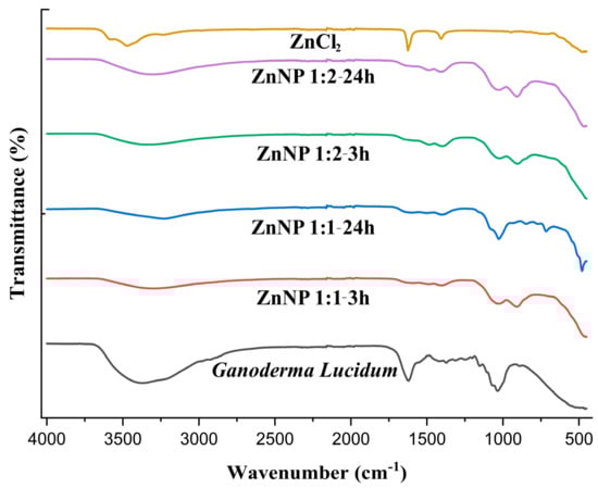 FTIR spectra of ZnCl2, Ganoderma Lucidum, and ZnNPs synthesized at different mixing rates (1:1 and 1:2) and times (3 h and 24 h).
