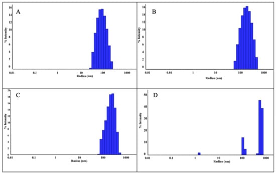 DLS analysis of ZnNPs obtained using mushroom extract/zinc salt, with mixing times of 1:1, 3 h (A); 1:1, 24 h (B); 1:2, 3 h (C); and 1:2, 24 h (D).