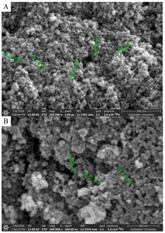 When SEM images are examined, considering the size analysis in Figure 4A,B, no significant difference was observed between diameters and shapes formed in NPs. However, compared to the nanoparticles synthesized with solutions used in a 1:1 volume ratio, a clear morphological change was observed in the 1:2 synthesis. While the nanoparticles seen in Figure 4A,B exhibited a spherical appearance, those in Figure 5A,B took on a flower-like structure. Morphological differences occurred, which are thought to be due to the mixing difference of the ZnNPs synthesized from zinc salt and mushroom solutions by mixing them in different ratios at different times (Figure 5A,B). In a previous study, Smirnov et al. ZnNPs have been observed to have a flower-like morphological form, and it has been stated that the “petals” of the flower structure of a few hundred nanometers are around 50–200 nm [14].
