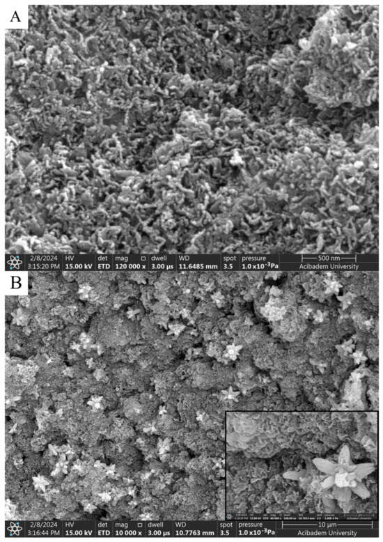 It is thought that the difference observed in morphology is due to the ratio of solution volumes used. In the nanoparticles obtained after 3 h of mixing, elongated and rod-like structures in contact with each other (Figure 5A) stand out. A flower-like morphological structure of 1–2 microns in size was observed in the nanoparticles obtained as a result of the 24 h mixture (Figure 5B).