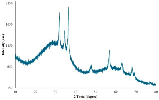 where K is the shape factor (usually 0.9), λ is the X-ray wavelength (1.54060 Å for Cu K-α1), β is the line broadening at FWHM in radians, and θ is the diffraction angle. Based on this equation, the mean size of the as-prepared ZnNPs was calculated to be approximately 44.18 nm and no characteristic peaks were observed other than ZnNPs. It is observed that these results are consistent with the SEM findings shown in Figure 4A.