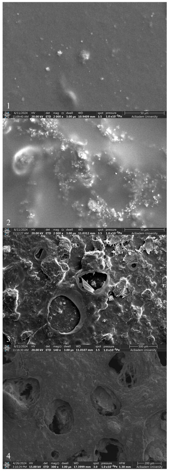 When SEM images are examined, smoothness is seen in the films prepared with PVA and Chi polymers (A, B1, and B2) (Figure 7-1–3). The SEM image of the PVA film shows a smooth surface appearance in pure PVA (Figure 7-1) and pure chitosan (Figure 7-2,3). The SEM images reveal that pure PVA exhibits a smooth and flat surface characterized by a homogeneous structure with minimal surface features. This smoothness is an indication of the well-structured nature of the polymer, devoid of significant defects or agglomerations [49]. The PVA/Chi (Figure 7-4) films show a consistent morphology with minimal visible defects. The presence of chitosan contributes to the overall smoothness by increasing the compatibility of the polymeric blend. While pure PVA (Figure 7-1) and pure chitosan (Figure 7-2,3) have a perfectly smooth surface, it is seen that the smoothness starts to deteriorate in the PVA/Chi blend. This is due to the increase in the duration of mechanical mixing stress [50] and thermal conditions [51] in other studies.