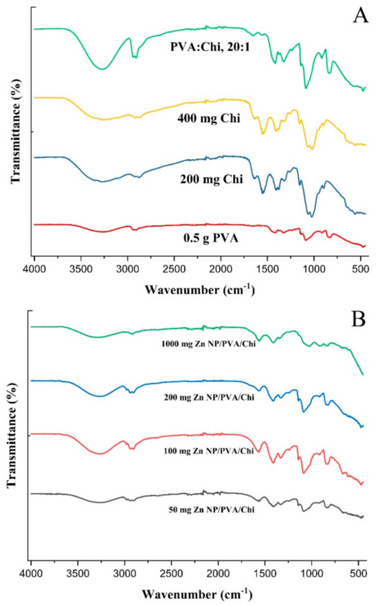 The FTIR spectrum of ZnNP-loaded PVA/Chi films (Figure 9B) exhibited a combination of the characteristic peaks observed in the spectra of pure PVA (Figure 9A), pure chitosan, and pure ZnNPs. For example, the strong absorption peak around 3300 cm−1 corresponding to the hydroxyl (-OH) groups of chitosan was present, along with the amide I band around 1650 cm−1 characteristic of chitosan. Additionally, the ZnNPs contributed their characteristic peaks in the spectrum. The changes in the FTIR spectra of PVA/Chi films with zinc nanoparticles (Figure 9B) indicated enhanced miscibility, the formation of hydrogen bonds, plasticizing effects, and the introduction of new functional groups. These changes collectively contributed to the improved structural integrity of the films, making them more resistant to mechanical stress and environmental factors [65].