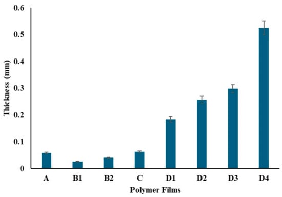 The film thicknesses were evaluated (Figure 10) and analyzed using ANOVA, as presented in Table 1. The analysis revealed a significant effect of different compositions on film thickness (F(7, 16) = 2244.16, p < 0.001), indicating substantial differences among the groups. Specifically, Film A, containing only 0.5 g of PVA, showed an average thickness of 0.058 mm. Films B1 and B2, containing 200 mg and 400 mg of chitosan respectively, had thicknesses of 0.025 mm and 0.04 mm. The Tukey HSD test confirmed significant differences between these films. Film C, with both 0.5 g PVA and 25 mg chitosan, displayed an average thickness of 0.062 mm, which was not significantly different from Film A. Films D1, D2, D3, and D4, which included increasing amounts of ZnNPs, exhibited progressively higher thicknesses, with the most significant differences observed for Film D4 (1000 mg ZnNP).