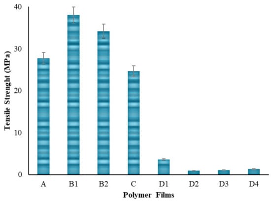 PVA is a polymer known to have an elastic structure. Hydrogen bonding between the hydroxyl groups of PVA molecules plays a crucial role in its elastic properties [66]. Additionally, water reduces the mechanical strength but increases the plasticity of PVA, making it more elastic [67]. With the addition of chitosan to the PVA polymer as seen in Figure 11, a decrease in tensile strength and elongation at break was observed. This result is consistent with the literature [68]. This indicates a decrease in the flexibility and elasticity of the film. Hydrogen bonds [66] and charge interactions [68] may be among the reasons for the decrease in strength when chitosan is bonded to PVA. In the strength analysis, it was seen that the polymer film with the highest elongation is the PVA film with 42 mm. When the Chi polymer is added to the PVA, the strength of the film decreases due to the natural brittleness [69] of chitosan. In addition, the molecular weight of chitosan plays an important role. Chitosan with lower molecular weight has less tendency to entanglement and interaction with PVA, which may lead to a decrease in the tensile strength and elongation properties of the mixture [58]. It is thought that using low molecular weight chitosan in this study might be one of the factors in the decrease in strength. In polymer films prepared by adding 50–100–200 mg of ZnNPs, a shape change occurred in the polymer films due to the increase in ZnNPs. It is thought that this is due to the hardness created by the ZnNPs added to the film. The lowest strength was observed in the polymer film prepared by adding 1000 mg. Depending on the amount of ZnNPs used, holes formed in the film and caused it to become a brittle structure. There might be multiple reasons for the decrease in tensile strength: nanoparticle agglomeration [70], poor interfacial bonding [70], and concentration effects [58].