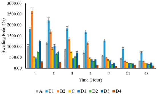 Polymeric substances have the capability to expand and hold a considerable volume of water within their framework. They maintain a flexibility level akin to natural tissue because of their high water content. Hydrogels’ water absorption ability is due to hydrophilic groups attached to the polymer backbone, while their resistance to dissolving is due to cross-links among network chains [71]. When PVA films were immersed in PBS solution, the swelling ratio was reported to be 674% in previous studies. In Figure 12, a lower swelling capacity was observed in the pure PVA film compared to the pure chitosan films at the first hour. When the chitosan films were evaluated at different concentrations within themselves (B1 and B2), it was observed that the swelling capacity increased as the amount of chitosan increased. The swelling capacity of the film prepared using 200 mg chitosan increased by 1800% at the first hour; the swelling capacity of the film prepared using 400 mg chitosan increased by 2655% at the first hour.