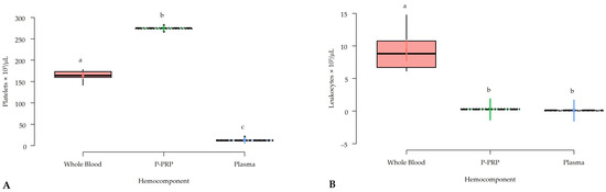 Box plots showing the means and their 95% confidence intervals (95% CIs) for (A) platelet and; (B) leukocyte counts in different hemocomponents. a–c = different lowercase letters denote significant differences (p < 0.001) for the variables evaluated by the Tukey test between hemocomponents. P-PRP = pure platelet-rich plasma.
