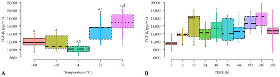 Box plots showing the means and their 95% CIs for (A) transforming growth factor beta 1 (TGF-β1) concentrations according to the temperature and; (B) the time factors. a–d = different lowercase letters denote significant differences (p < 0.05) for the variables evaluated by the Tukey test between hemocomponents.