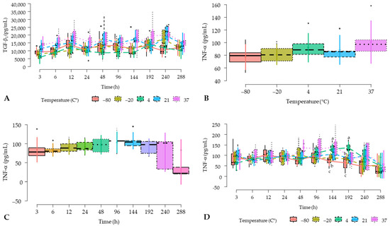 Box plots showing the means and their 95% CIs for (A) transforming growth factor beta 1 (TGF-β1) concentrations according to temperature and time factor interaction; (B) tumor necrosis factor alfa (TNF-α) concentrations according to the temperature factor; (C) TNF-α concentrations according to the time factor; and (D) TNF-α concentrations according to temperature and time factor interaction. a–c = different lowercase letters denote significant differences (p < 0.05) for the variables evaluated by the Tukey test between hemocomponents.