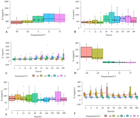 Box plots showing the means and their 95% CIs for (A) IL-2 (IL-2) concentrations according to the temperature factor; (B) IL-2 concentrations according to the time factor; (C) IL-2 concentrations according to temperature and time factor interaction; (D) IL-6 concentrations according to temperature factor; (E) IL-6 concentrations according to the time factor. (F) IL-2 concentrations according to temperature and time factor interaction. Note: For specific statistically significant differences in IL-6 concentrations according to the interaction of temperature and time factors, see Supplementary Table S1.