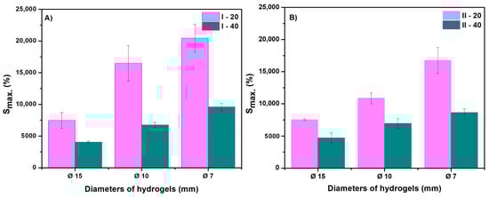 | Code Hydrogels | Smax. (%) | EWC (%) |