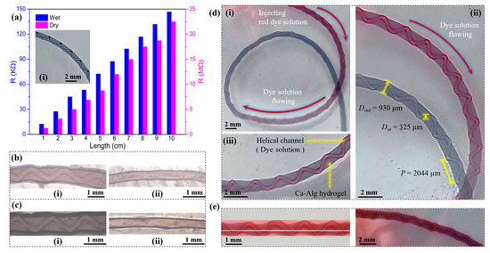 - The pitches of the helical channels varied without a clear pattern. This might be due to the fact that in addition to Qout and Qin, weak factors like the crosslinking reaction conditions, gravity, the force generated by the inner wall of the capillary glass tube, and the axial resistance generated by entry into the solidification receiving bath all had an influence on p. The current experimental conditions did not allow us to conduct control variable comparison tests for these weak factors.