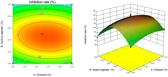Figure 1. Contour map and response surface map of chitosan content and sodium alginate content.