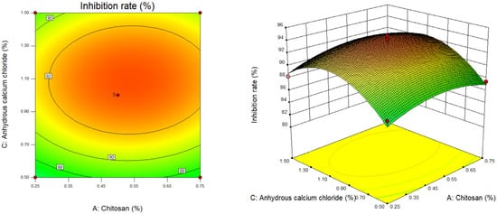 Figure 2. Contour map and response surface map of chitosan content and anhydrous calcium chloride content.