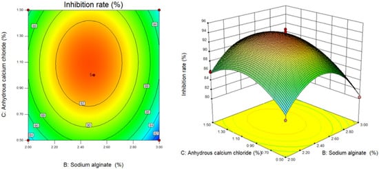 Figure 3. Contour map and response surface map of sodium alginate content and anhydrous calcium chloride content.