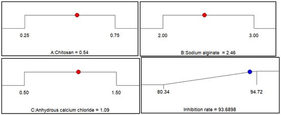 In this study, we selected chitosan content (X1), sodium alginate content (X2) and anhydrous calcium chloride content (X3), which have a great influence on the algae inhibition rate of berberine sustained-release capsule materials, as independent variables, and the algae inhibition rate Y was used as the response value. The Box–Behnken central composite test in the Design Expert software was used to design a three-factor and three-level response surface optimization experiment to further optimize the parameters in the preparation process of berberine sustained-release capsule materials. The factors and level design of the response surface experiment are shown in Table 3.