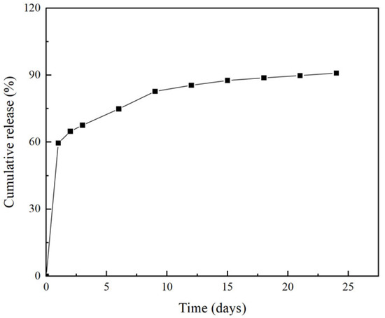 Sustained-release capsules are drug carriers based on natural or synthetic polymer materials, which have the advantages of slow drug release, prolonged drug action time and improved drug stability [27,28,29]. In the process of practical application, in order to ensure the safety and effectiveness of the sustained-release microsphere material, it is necessary to study its release capacity, to obtain a more reasonable delivery scheme and improve the utilization rate of resources. We measured the release of the optimized berberine sustained-release microsphere material within 24 days, and the release curve is shown in Figure 5.