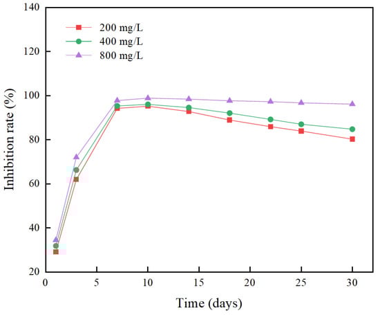 Under the long-term algae inhibition experiment of 30 days, the changes in the growth inhibition rate (IR) of different concentrations of berberine sustained-release microsphere materials on Microcystis aeruginosa cells are shown in Figure 9. The results showed that each concentration group could effectively inhibit the growth of Microcystis aeruginosa cells. In the first 10 days of the experiment, the IR values of each group continued to increase, and the lowest concentration group (200 mg/L) had the highest IR of 95.26%. After 10 days, the inhibitory effect of the low concentration group (200, 400 mg/L) on Microcystis aeruginosa cells gradually weakened, and its growth inhibition rate showed a downward trend, but the decline was relatively slow. The IR values were 84.83% and 80.29% on the 30th day, respectively. The IR value of the high-concentration group (800 mg/L) was always at a high level, up to 98.91%, and remained above 90% after 30 days. This result is similar to the conclusion of Lei Zhangyue [34].