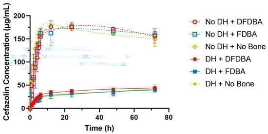 Future experiments may focus on the cytotoxicity of the cefazolin/DH drug delivery system via cell culture with osteoblasts, the drug release over a long period, or in vivo experiments to investigate the biocompatibility, the potential for antibiotic resistance with prolonged low-level release, and the effects on bone regeneration kinetics. Alternatively, studies concerning the delayed release of growth factors may be an interesting area of research, as such therapies are currently receiving much attention [].