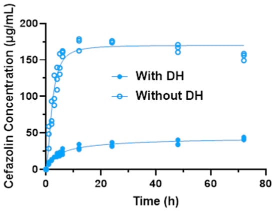 Due to the differences between the drug concentrations with and without DH, individual logistic growth models were fit for the two separately (Figure 3). For samples with DH (test), the estimated maximum concentration achieved was 36.97 ± 2.39 μg/mL (95% CI: 34.58–39.36). The estimated growth rate was 0.27 (95% CI: 0.17–0.37). At 4.17 h (95%: 3.26–5.07), the concentration reached half the maximum value. For samples without DH (control), the estimated maximum concentration achieved was 167.4 ± 7.0 μg/mL (95% CI: 160.4–174.4). The estimated growth rate was 0.70 (95% CI: 0.54–0.87). At 2.36 h (95% CI: 2.05–2.67), the concentration reached half the maximum value. These results demonstrate that with DH, the cefazolin concentration increased at a much slower and steady rate than the controls (without DH) (Table 1).