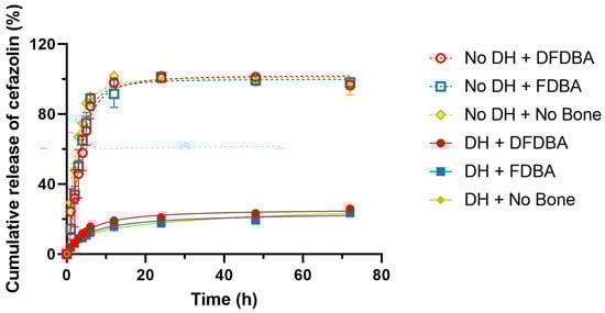 Cumulative release of cefazolin. The curve indicates that without DH, cephazolin is released fast and early, while all formulations containing DH demonstrate a sustained steady release.