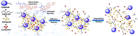 In this investigation, we were able to show the effectiveness of PAMAM/PEG-DA dendrimer hydrogels (DH) in slowing the in vitro release of cefazolin. The mechanism of this effect could be due to one or more of the following interactions between cefazolin and the DH (Figure 5):
