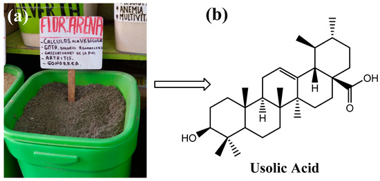Commercialization of flor de arena in herb shops in Peru (a) and structure of ursolic acid (b).
