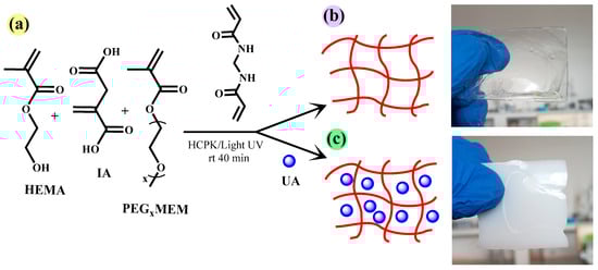 In order to transport UA to the adsorption site and improve the bioavailability of this molecule, we selected the monomers HEMA, PEGxMEM, and IA to prepare hydrogels (Figure 2b,c). Free radical polymerization was initiated by HCPK, and was photo-activated. These free radicals propagate with the HEMA, PEGxMEM, and IA monomers to form polymer chains. The crosslinking agent MBA facilitates the formation of chemical bonds between the polymer chains, creating a three-dimensional network (Figure 2a).