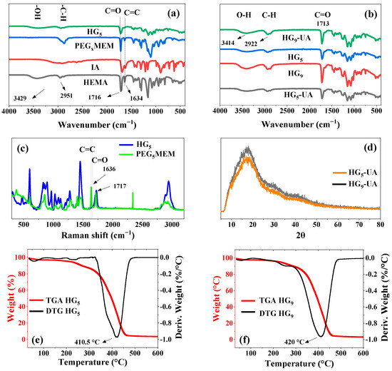 FT-IR spectra of HG5 and monomers (a), FT-IR spectra of hydrogels (HG5 and HG9) and hydrogels loaded with UA (HG5-UA and HG9-UA) (b), Raman spectrum of PEG5MEM and HG5 (c), XRD analysis of HG5-UA and HG9-UA (d), TGA/DTG curves of HG5 (e), and TGA/DTG curves of HG9 (f).