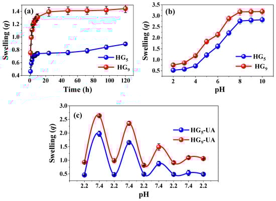 Cyclic swelling of HG5-UA and HG9-UA hydrogels was evaluated in buffer solutions simulating gastrointestinal conditions: pH 2.2 and 7.4 at 37 °C (Figure 4c). Figure 4c shows that in the first cycle, HG5-UA reaches a qmax of 0.45 at pH 2.2 and 1.97 at pH 7.4. In the case of HG9-UA, the qmax is 0.93 at pH 2.2 and 2.64 at pH 7.4. A decrease in swelling capacity after each cycle is noted, attributable to ion–dipole interactions between polymer chains [23].