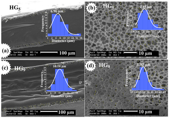 The pore size of HG5 hydrogel at contour (a) and surface (b), and of HG9 hydrogel at contour (c) and surface (d), both at pH 7.4.