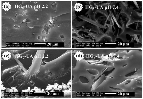 SEM micrographs were also taken of the UA-loaded hydrogels, i.e., HG5-UA and HG9-UA, at pH 2.2 and 7.4 (Figure 7). Figure 7 shows the UA crystals in the pores of the hydrogels. At pH 2.2 the pores are compressed, trapping the UA crystals, which would prevent the release of UA in an acidic environment. At pH 7.4 the pores are open, which would allow the release of UA in a basic environment.