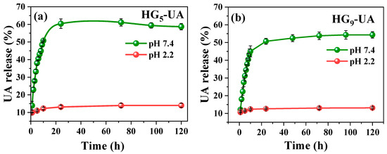 UA release profiles of HG5-UA (a) and HG9-UA (b) hydrogels at pH 2.2 and 7.4.