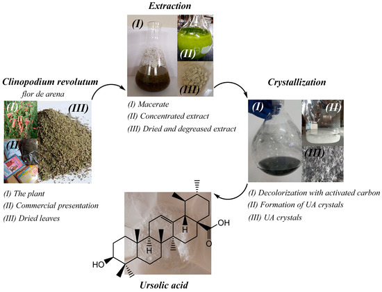 Ursolic acid (UA) was extracted from the medicinal plant Clinopodium revolutum, which is known as flor de arena in local herbal shops. The methodology was developed in a previous work [5]; 50 g of dried leaves of Clinopodium revolutum was macerated in 200 mL of ethanol (96%) for 24 h. Then, it was filtered and macerated again. The process was repeated three times. The ethanolic extract obtained was concentrated to dryness using a rotary evaporator, dried, and degreased with petroleum ether. The degreased extract was redissolved in 150 mL of ethanol (96%) and kept refrigerated for 24 h. The precipitate obtained was filtered and dried in an oven at 60 °C for 12 h. Crystallization was carried out in 90 mL of ethanol (96%) at 60 °C and 5 g of activated carbon was used for decolorization. The mixture was kept under constant stirring for 5 min and then filtered with a vacuum pump. The filtrate obtained was crystallized at 4 °C for 12 h. After this time, the crystals were filtered, washed with cold ethanol, and dried in an oven at 60 °C for 1 h. The extraction procedure is shown in Figure 9.