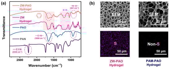 (a) The FT-IR spectra of the ZW-PAO hydrogel, PZW hydrogel, PAO, and PAN; (b) the EDS mappings of the ZW-PAO hydrogel and PAM-PAO hydrogel.