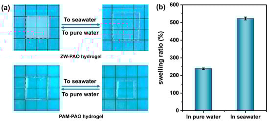 (a) The photos of the switching of the ZW-PAO hydrogel and PAM-PAO hydrogel in seawater and pure water; (b) swelling ratio of the ZW-PAO hydrogel in pure water and seawater water.