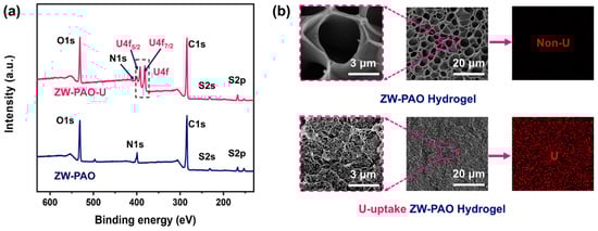 The characterization of the ZW-PAO hydrogel before and after U-extraction: (a) the XPS spectra; (b) the SEM and EDS mapping images.